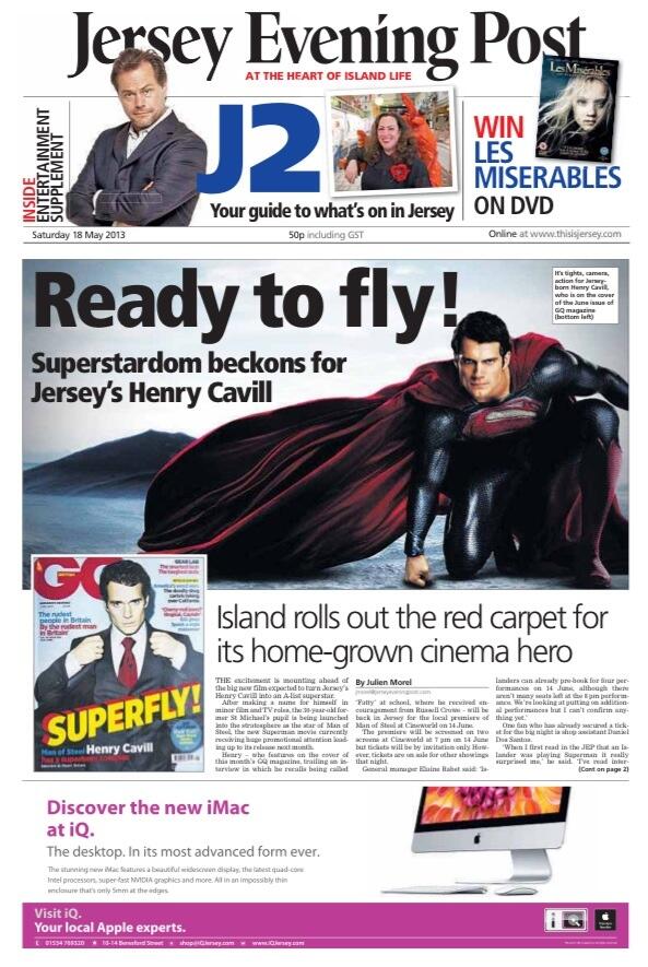 From all the Man of Steel premieres that Henry will be attending, we're guessing the one that will mean the most is the premiere scheduled for June 14 in Jersey. Today his home island newspaper proudly put him on the cover for all to see. Read what they had to say about their Superman, as they prepare to welcome him home.